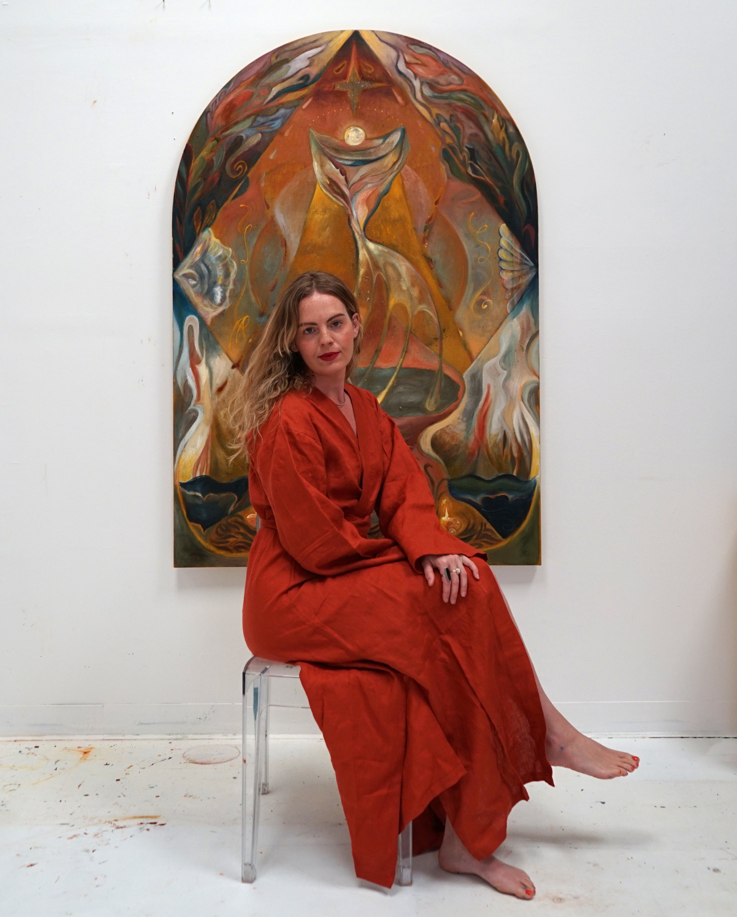 Margaret R. Thompson is a New Mexico–based painter whose work explores the hidden structures that connect humans to the wider cosmos. Her paintings inhabit a warm, shimmering world where earth and celestial realm mingle, and every element carries its own quiet intelligence. Working with oils, wax, sand, soil, and plant-based materials, she creates symbolic narratives shaped by field studies, metaphysical research, music and automatism. In each piece, figures blend into their surroundings, symbols surface and recede, and natural forms hold equal weight to human ones. Thompson is curious in building visual systems that collapse hierarchy between species and elements and dissolve the boundaries of time and space.